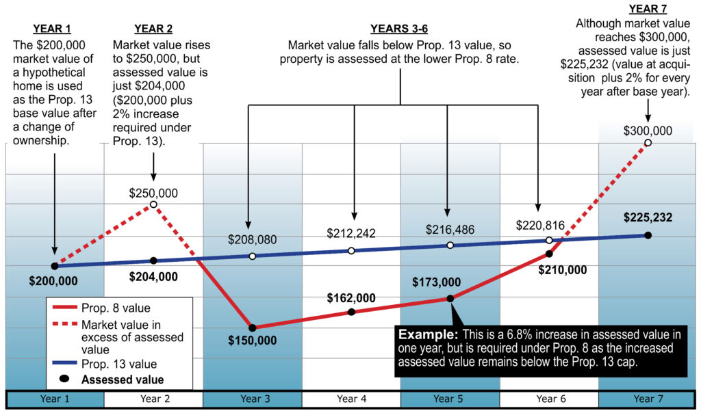 - Years 3-6: The market value of the property has decreased below the factored base year value (prop 13) limit. The assessment, upon request of the property owner, would be reduced to the actual market value.